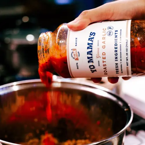 Yo Mama's Roasted Garlic tomato sauce is handcrafted with fresh tomatoes, roasted garlic, fresh onions, and olive oil. Perfectly made in small batches, our Mama-approved recipe has no added sugar, no GMOs, no preservatives, and no gluten.